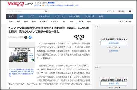 令和8年1月30日、Yahoo!ニュースで落石発生源PUR工法が紹介されました。